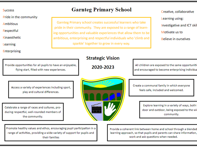 Garnteg Primary school creates successful learners who take pride in their community. They are exposed to a range of learning opportunities and valuable experiences that allow them to be ambitious, enterprising and respectful individuals who ‘Climb and Sparkle’ together to grow in every way.